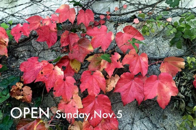 11月最初のオープンは連休最後の日、あさっての日曜日です。 11月5日 11:00 – 18:00 紅葉していた庭の蔦が、少しずつ散ってゆく冬のはじまり。 日曜日のひとときを、のんびりと過ごしていただけたらと