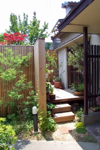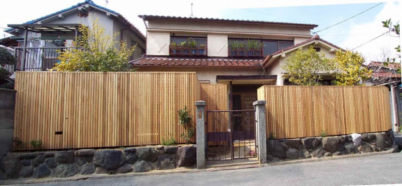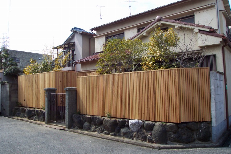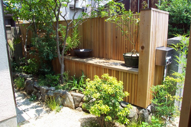 ウバメガシを撤去して木製フェンスを制作、気配は感じれるが中が良く見えない間隔で板を縦にはりました。