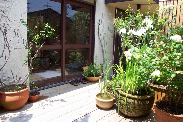 鉢に植え替えていた庭にあった植物を配置、いろいろと園芸店やホームセンターで買ってきて置いています。
