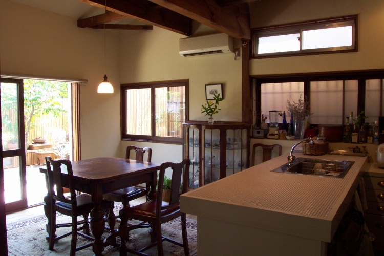 間仕切壁を取っ払って台所とつなげ補強の梁を入れています。