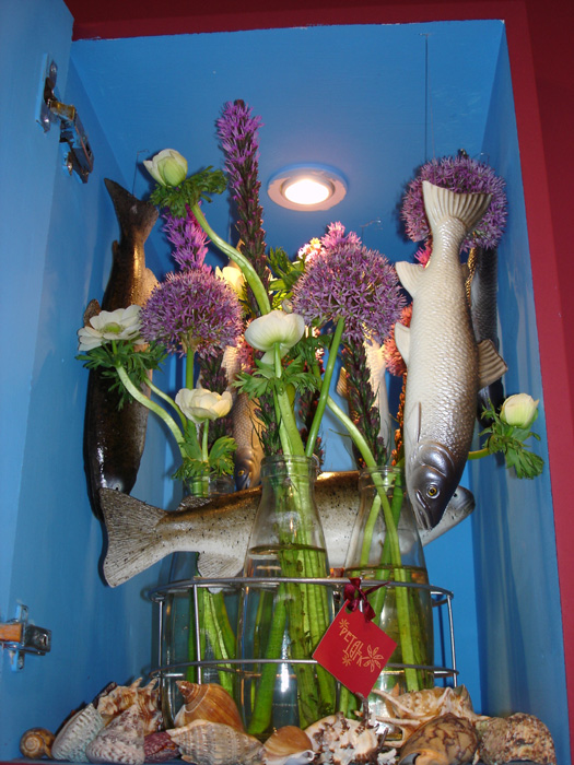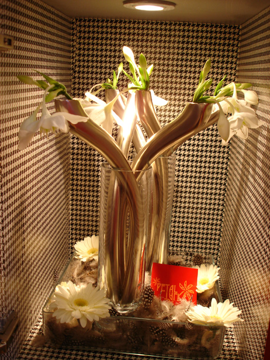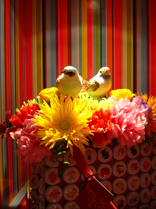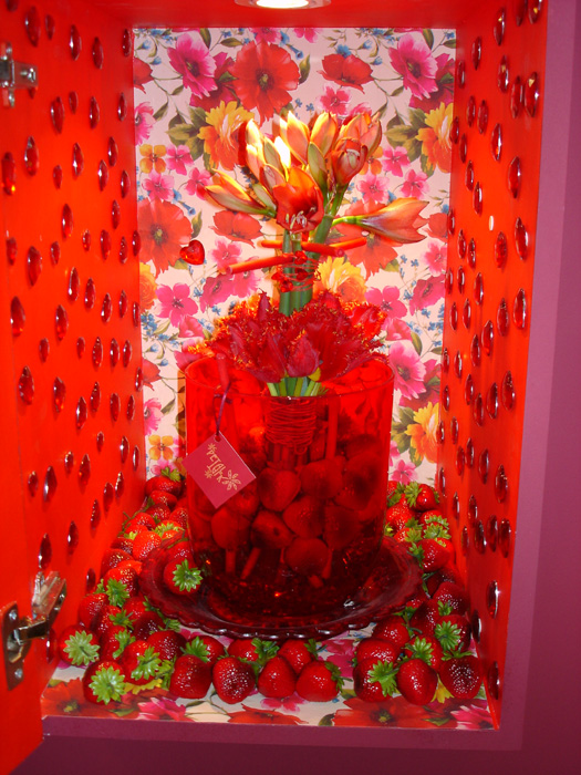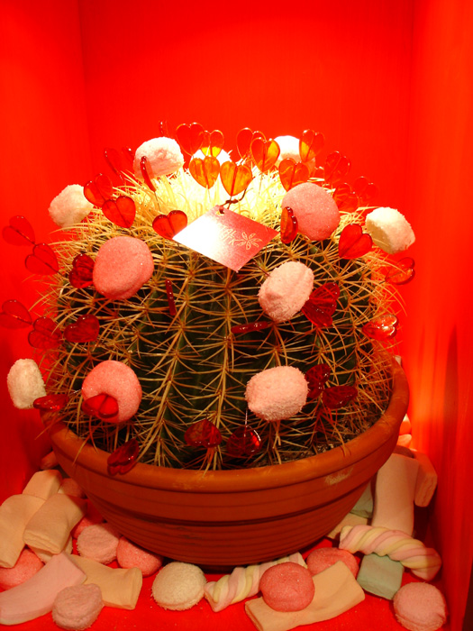 昨日送りましたブースですがあの写真の後ろに たくさんの棚 60センチX40センチくらいの棚で それぞれの棚は閉じられていてそこには「愛」や「グランブルー」 「語り合い」などの題が書かれていてそれを開けるとその題を現すデコレーションがされていました。 サボテンの題はなんだと思います? 「姑」でした