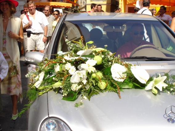 旧市街の中の教会で結婚式がおこなわれたいました。車のデコレーション。